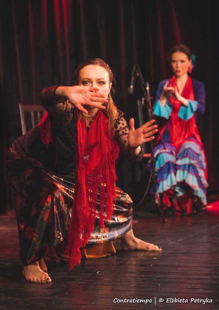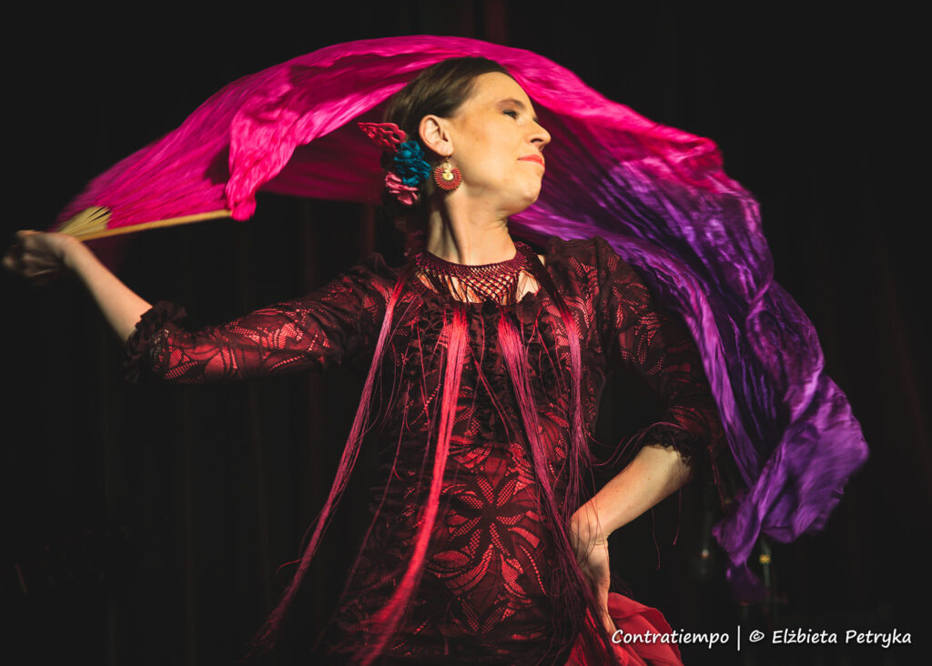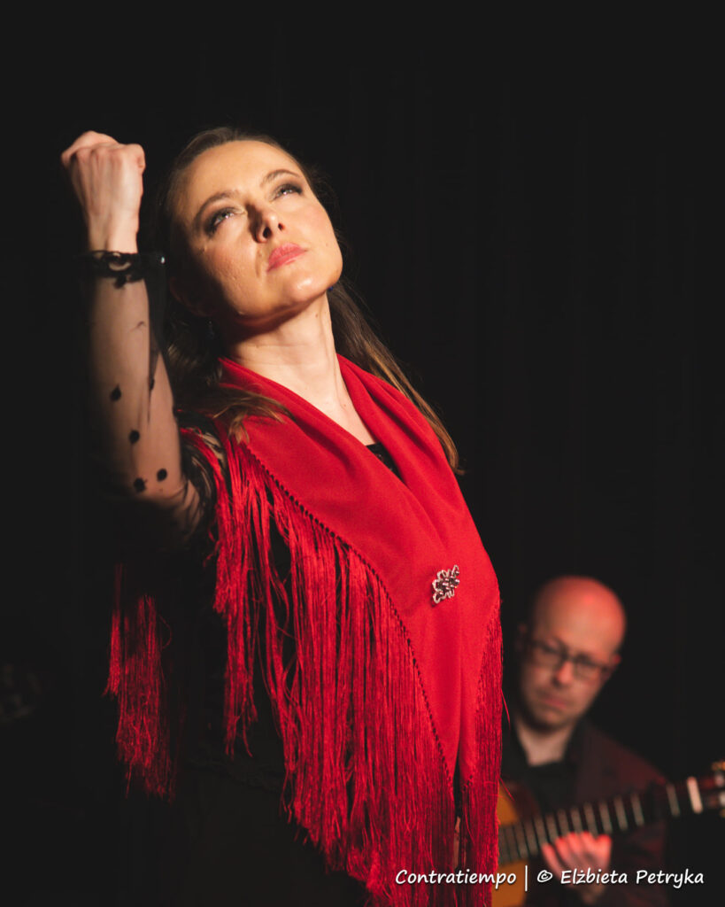 To chyba nie tylko moje wrażenie – publiczność jest w szampańskim nastroju, a ja cieszę się, widząc, że moja córka podryguje w takt muzyki. Rzeczywiście trudno się temu oprzeć. Contratiempo zadbali o dobry repertuar, w którym tradycyjne flamenco miesza się z tanecznymi i muzycznymi eksperymentami i tworzy ciekawe fuzje. Obok widowiskowego Garrotina, zatańczonego w duecie na zakończenie wieczoru oraz Alegrias Dominiki Kupniewskiej z pełnym wyrazu i energii stepem, pojawi się Martinete/Siguirias z kastanietami Karoliny Łucznik – ciężkie, pełne powagi i głębokiego zwrócenia się do wewnątrz samej siebie. Szalenie ciekawą choreografią jest również zatańczony przez nią boso Tientos, w którym klasyczne flamenco miesza się z elementami tańca nowoczesnego. Karolina Łucznik opowiada w nim własną, przepełnioną bólem i pełną napięcia historię, w której każdy gest, drobne poruszenie ramion, wyraz twarzy mają swoje ukryte znaczenie.