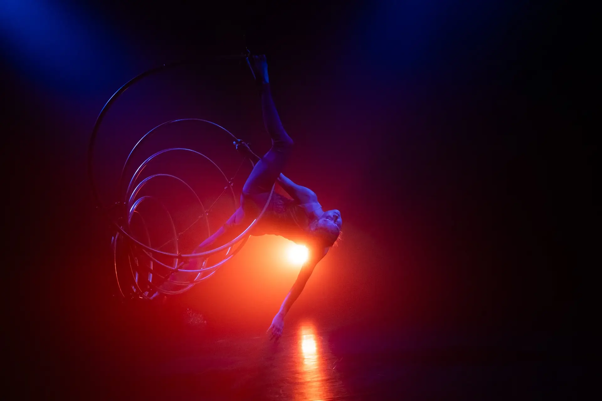 Najpierw z ciemności i oparów mgły wyłania się szkielet klatki otaczającej drobną kobietę jak kokon. Widać tylko lekko poruszającą się sylwetkę wewnątrz. Wraz z nią, wisząca w powietrzu konstrukcja faluje, drży i wiruje jakby dotknięta podmuchem wiatru. Artystka postanawia zbadać ją od zewnątrz i klatka-kokon staje się przemieszczającą się nad sceną, interaktywną strukturą, rusztowaniem dla poetyckich, płynnych tanecznych akrobacji. Na tym etapie trudno oddzielić je od siebie – konstrukcja momentami wydaje się być bionicznym pancerzem, częścią tańczącej, innym razem jest jedynie ograniczającym ruchy szkieletem, który należy porzucić.