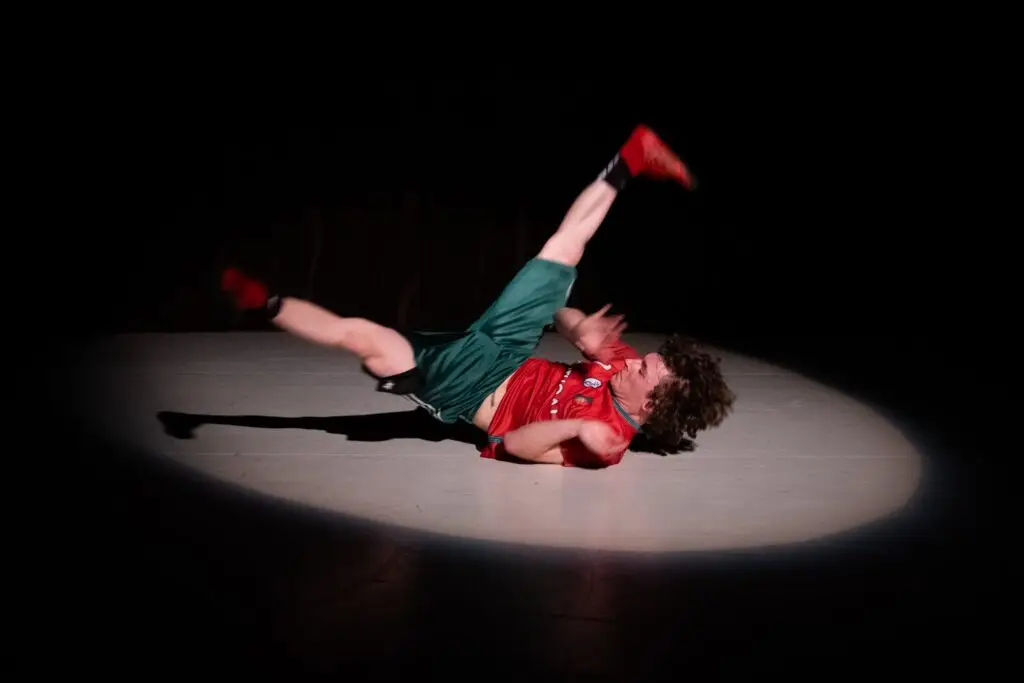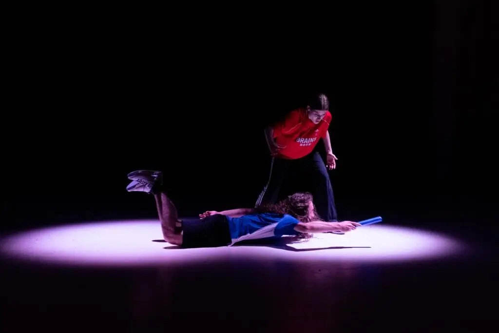 Kiedy z rampy padają snopy kolorowych świateł spodziewam się jednego z topowych raperskich hitów i grupy b-boys i b-girls ubranych w luźne sportowe stroje. W rzeczywistości dzieje się inaczej. Spektakl rozpoczyna wrzawa gromadzących się kibiców i hymn polski, w świetle reflektorów, w rzędzie, w postawie na baczność, stoją tancerze i tancerki. To sygnał, że scena będzie miejscem trwającej dysputy: taniec czy sport? Choreografia zaczyna się od dynamicznych działań solo i w grupie przypominających rozgrzewkę, artyści ubrani są w sportowe stroje – każdy inaczej, wśród ćwiczących nie brakuje również postaci z gwizdkiem na szyi – sędziego lub trenera. W kolejnych odsłonach widzimy różne dyscypliny sportowe: piłkę nożną, kolarstwo, boks, koszykówkę, sztafetę olimpijską. Odpowiadają one formom improwizowanej rywalizacji w breakdance takim jak battle (bitwa), w której naprzeciw siebie stają dwaj tancerze lub dwie grupy i nie dotykając się wchodzą ze sobą w interakcję – gestykulacją i mimiką okazują sobie nawzajem wyższość, lekceważenie albo podziw dla przeciwnika. Liczy się zarówno technika, jak i wyczucie rytmu oraz własny, niepowtarzalny styl. Inną formą jest cypher (kółeczko), gdzie tańczący tworzą kółko, w którego środku każdy, kto chce prezentuje swoje umiejętności.